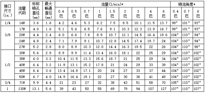 • 喷雾形状呈广角实心锥形,喷射区域呈方形,在0.7bar(10psi)压力下,喷流角度为101°到115°。